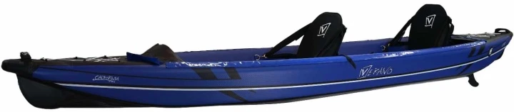 Das Verano California Duo Set besteht aus einem aufblasbarem Kajak mit komfortablen Sitzen, zwei Paddeln, Packtasche mit Rollen, Pumpe und Reparaturset. Die Paddel sind 4-teilig mit Blättern aus Polypropylen (je 240 cm, 950 g). Die Aufbau-/Pumpzeit beträgt etwa 9 Minuten.